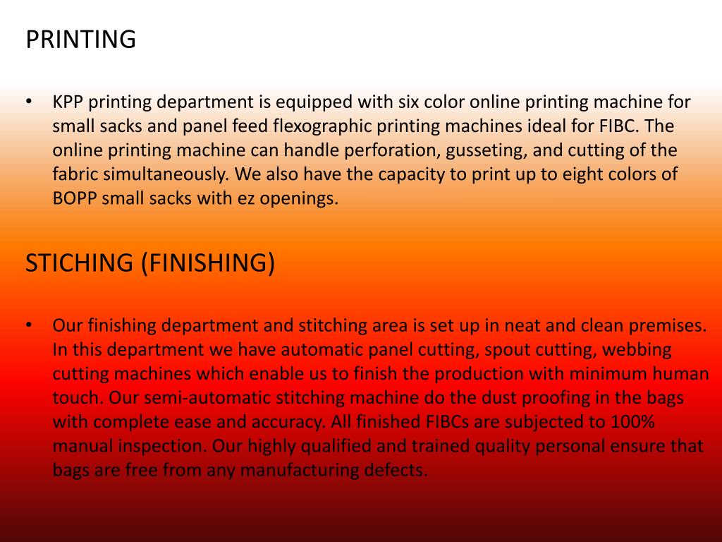 PRINTING • KPP printing department is equipped with six color online printing machine for small sacks and panel feed flexographic printing machines ideal for FIBC. The online printing machine can handle perforation, gusseting, and cutting of the fabric simultaneously. We also have the capacity to print up to eight colors of BOPP small sacks with ez openings. STICHING (FINISHING) • Our finishing department and stitching area is set up in neat and clean premises. In this department we have automatic panel cutting, spout cutting, webbing cutting machines which enable us to finish the production with minimum human touch. Our semi-automatic stitching machine do the dust proofing in the bags with complete ease and accuracy. All finished FIBCs are subjected to 100% manual inspection. Our highly qualified and trained quality personal ensure that bags are free from any manufacturing defects.