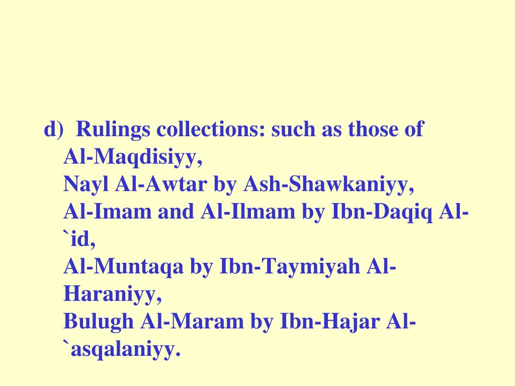 d) Rulings collections: such as those of Al-Maqdisiyy, Nayl Al-Awtar by Ash-Shawkaniyy, Al-Imam and Al-Ilmam by Ibn-Daqiq Al-`id, Al-Muntaqa by Ibn-Taymiyah Al-Haraniyy, Bulugh Al-Maram by Ibn-Hajar Al-`asqalaniyy.