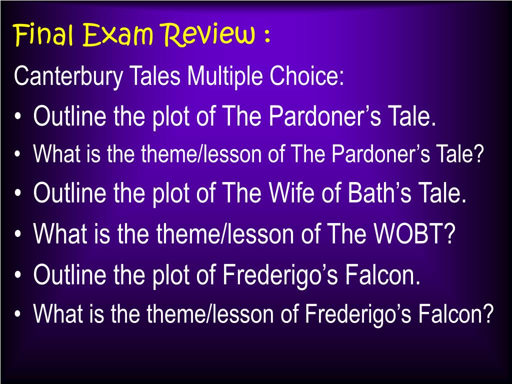 Final Exam Review : Canterbury Tales Multiple Choice: • Outline the plot of The Pardoner’s Tale. • What is the theme/lesson of The Pardoner’s Tale? • Outline the plot of The Wife of Bath’s Tale. • What is the theme/lesson of The WOBT? • Outline the plot of Frederigo’s Falcon. • What is the theme/lesson of Frederigo’s Falcon?