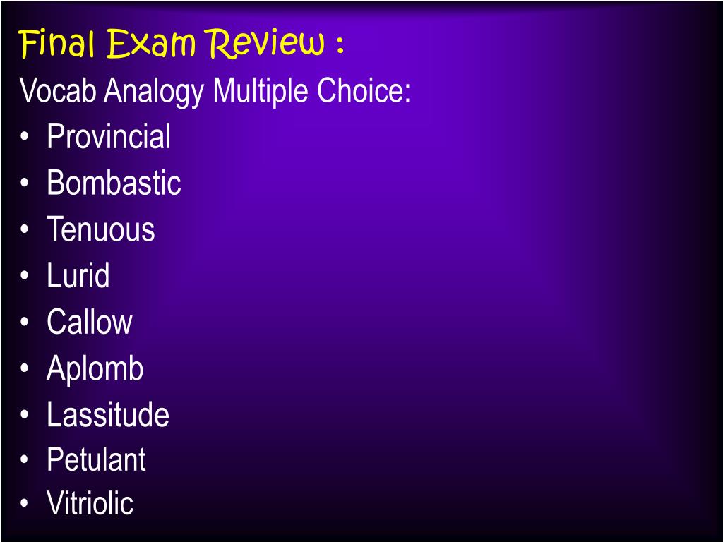 Final Exam Review : Vocab Analogy Multiple Choice: • Provincial • Bombastic • Tenuous • Lurid • Callow • Aplomb • Lassitude • Petulant • Vitriolic