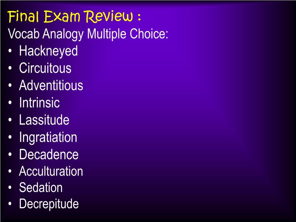 Final Exam Review : Vocab Analogy Multiple Choice: • Hackneyed • Circuitous • Adventitious • Intrinsic • Lassitude • Ingratiation • Decadence • Acculturation • Sedation • Decrepitude
