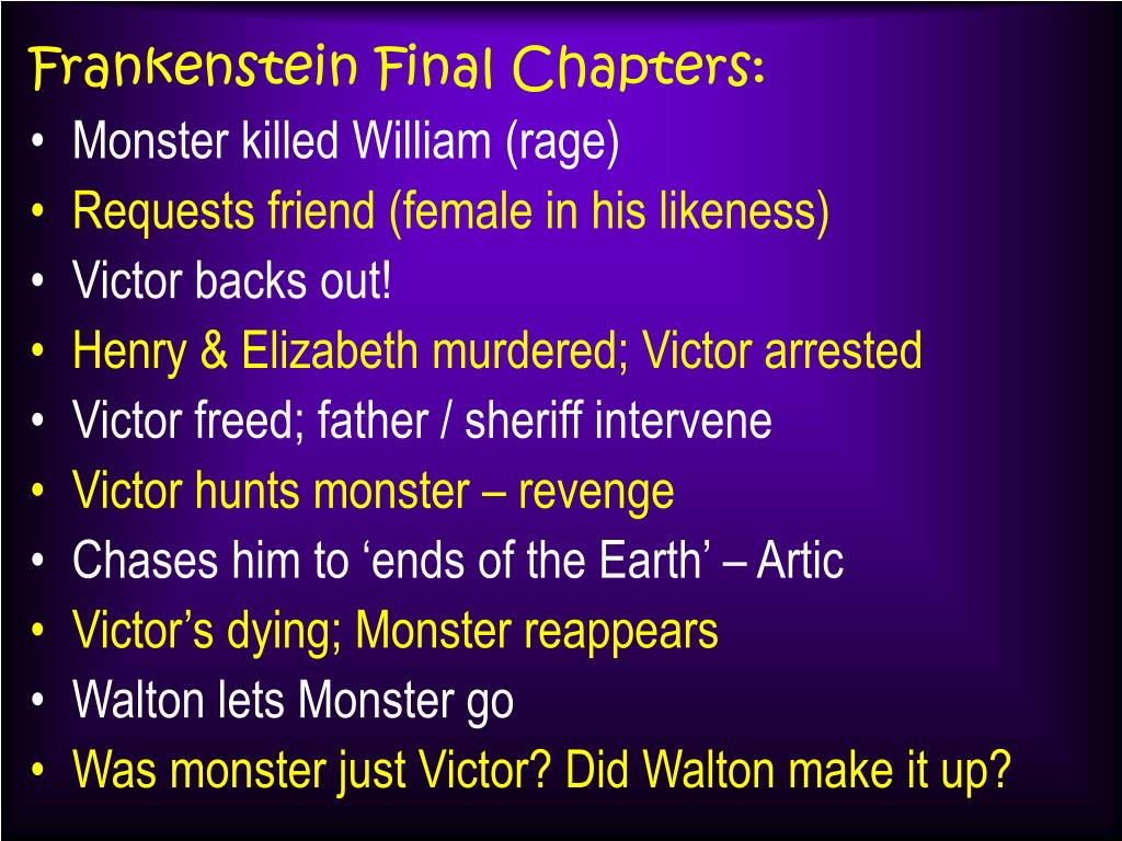 Frankenstein Final Chapters: • Monster killed William (rage) • Requests friend (female in his likeness) • Victor backs out! • Henry & Elizabeth murdered; Victor arrested • Victor freed; father / sheriff intervene • Victor hunts monster – revenge • Chases him to ‘ends of the Earth’ – Artic • Victor’s dying; Monster reappears • Walton lets Monster go • Was monster just Victor? Did Walton make it up?
