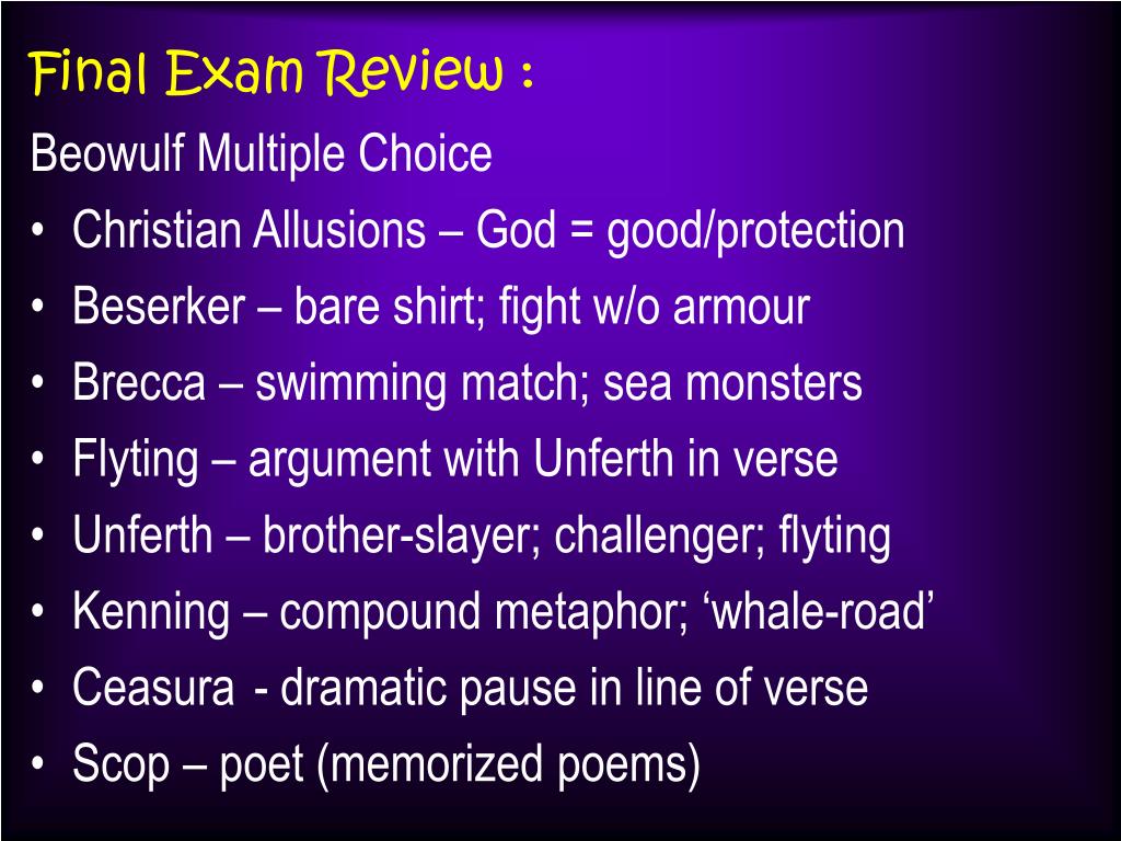 Final Exam Review : Beowulf Multiple Choice • Christian Allusions – God = good/protection • Beserker – bare shirt; fight w/o armour • Brecca – swimming match; sea monsters • Flyting – argument with Unferth in verse • Unferth – brother-slayer; challenger; flyting • Kenning – compound metaphor; ‘whale-road’ • Ceasura - dramatic pause in line of verse • Scop – poet (memorized poems)