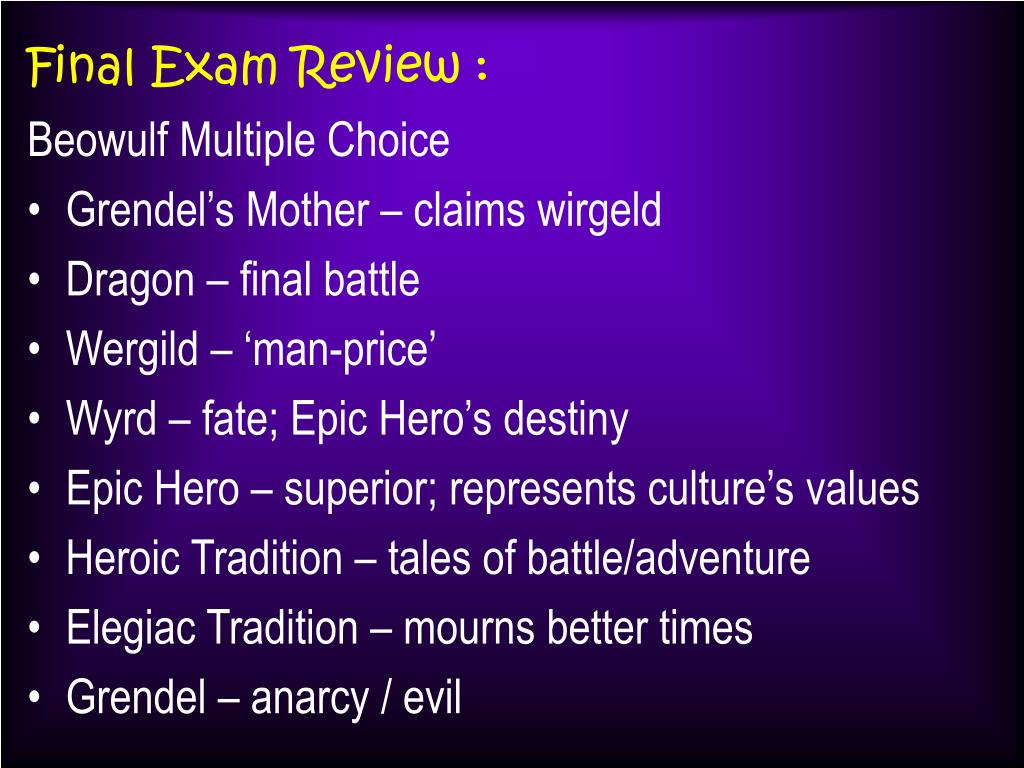 Final Exam Review : Beowulf Multiple Choice • Grendel’s Mother – claims wirgeld • Dragon – final battle • Wergild – ‘man-price’ • Wyrd – fate; Epic Hero’s destiny • Epic Hero – superior; represents culture’s values • Heroic Tradition – tales of battle/adventure • Elegiac Tradition – mourns better times • Grendel – anarcy / evil