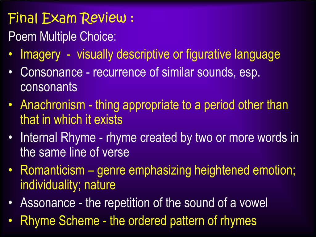 Final Exam Review : Poem Multiple Choice: • Imagery - visually descriptive or figurative language • Consonance - recurrence of similar sounds, esp. consonants • Anachronism - thing appropriate to a period other than that in which it exists • Internal Rhyme - rhyme created by two or more words in the same line of verse • Romanticism – genre emphasizing heightened emotion; individuality; nature • Assonance - the repetition of the sound of a vowel • Rhyme Scheme - the ordered pattern of rhymes