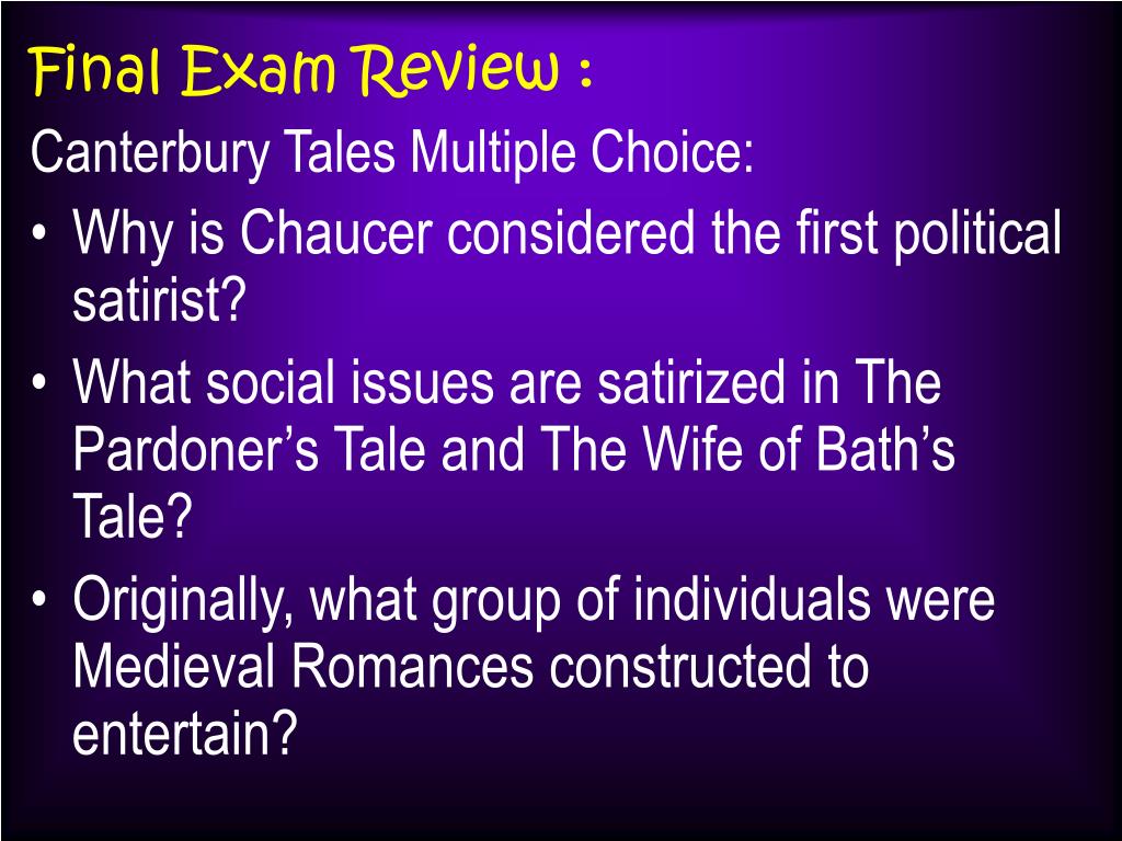 Final Exam Review : Canterbury Tales Multiple Choice: • Why is Chaucer considered the first political satirist? • What social issues are satirized in The Pardoner’s Tale and The Wife of Bath’s Tale? • Originally, what group of individuals were Medieval Romances constructed to entertain?