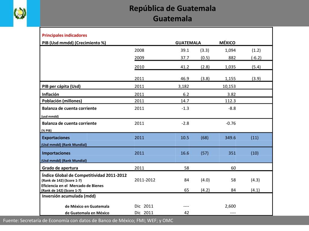 República de Guatemala Guatemala Fuente: Secretaría de Economía con datos de Banco de México; FMI; WEF; y OMC