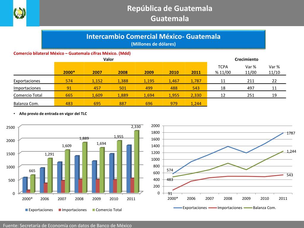República de Guatemala Guatemala. Fuente: Secretaría de Economía con datos de Banco de México; FMI; WEF; y OMC. República de Guatemala Guatemala. Intercambio Comercial México- Guatemala (Millones de dólares). Fuente: Secretaría de Economía con datos de Banco de México.