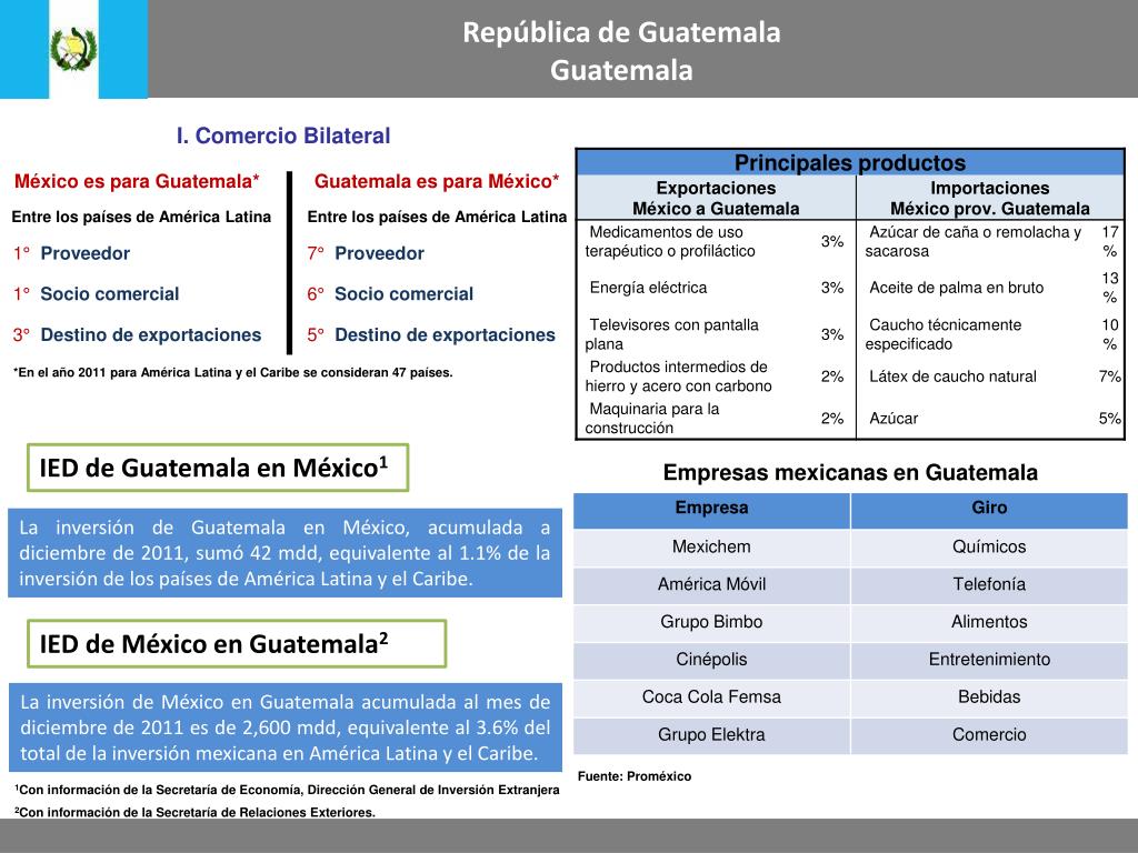 República de Guatemala Guatemala I. Comercio Bilateral México es para Guatemala* Guatemala es para México* Entre los países de América Latina Entre los países de América Latina 1° Proveedor 1° Socio comercial 3° Destino de exportaciones 7° Proveedor 6° Socio comercial 5° Destino de exportaciones *En el año 2011 para América Latina y el Caribe se consideran 47 países. IED de Guatemala en México1 La inversión de Guatemala en México, acumulada a diciembre de 2011, sumó 42 mdd, equivalente al 1.1% de la inversión de los países de América Latina y el Caribe. IED de México en Guatemala2 La inversión de México en Guatemala acumulada al mes de diciembre de 2011 es de 2,600 mdd, equivalente al 3.6% del total de la inversión mexicana en América Latina y el Caribe. Fuente: Proméxico 1Con información de la Secretaría de Economía, Dirección General de Inversión Extranjera 2Con información de la Secretaría de Relaciones Exteriores.