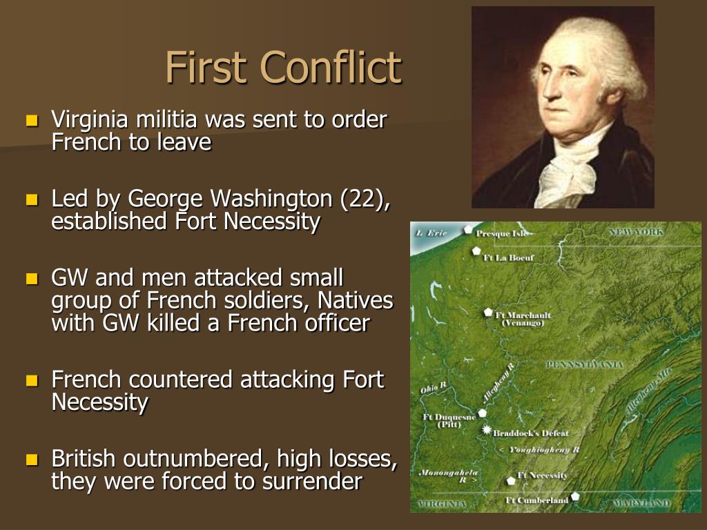 First Conflict • Virginia militia was sent to order French to leave • Led by George Washington (22), established Fort Necessity • GW and men attacked small group of French soldiers, Natives with GW killed a French officer • French countered attacking Fort Necessity • British outnumbered, high losses, they were forced to surrender