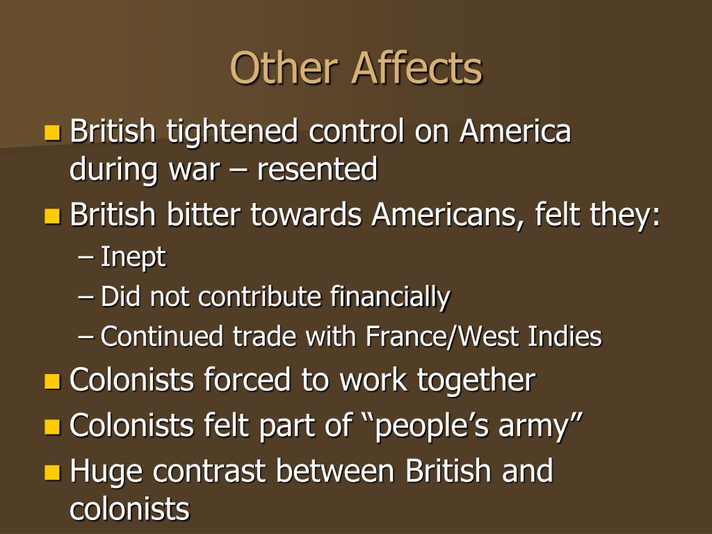 Other Affects • British tightened control on America during war – resented • British bitter towards Americans, felt they: • Inept • Did not contribute financially • Continued trade with France/West Indies • Colonists forced to work together • Colonists felt part of “people’s army” • Huge contrast between British and colonists