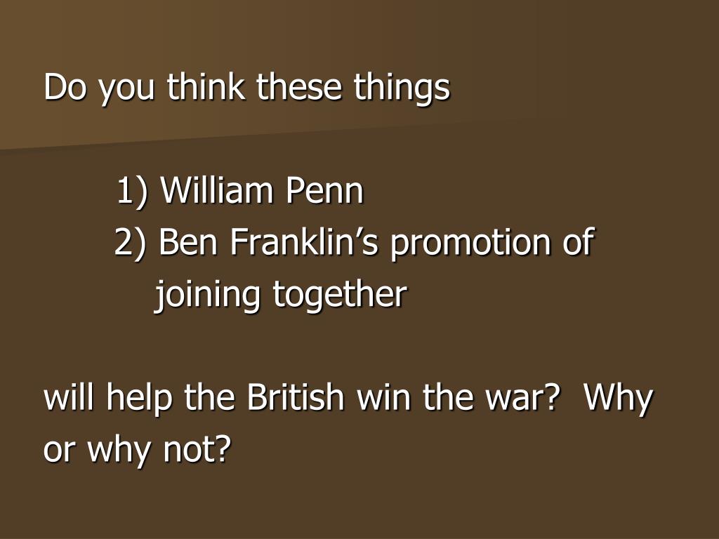 Do you think these things 1) William Penn 2) Ben Franklin’s promotion of joining together will help the British win the war? Why or why not?