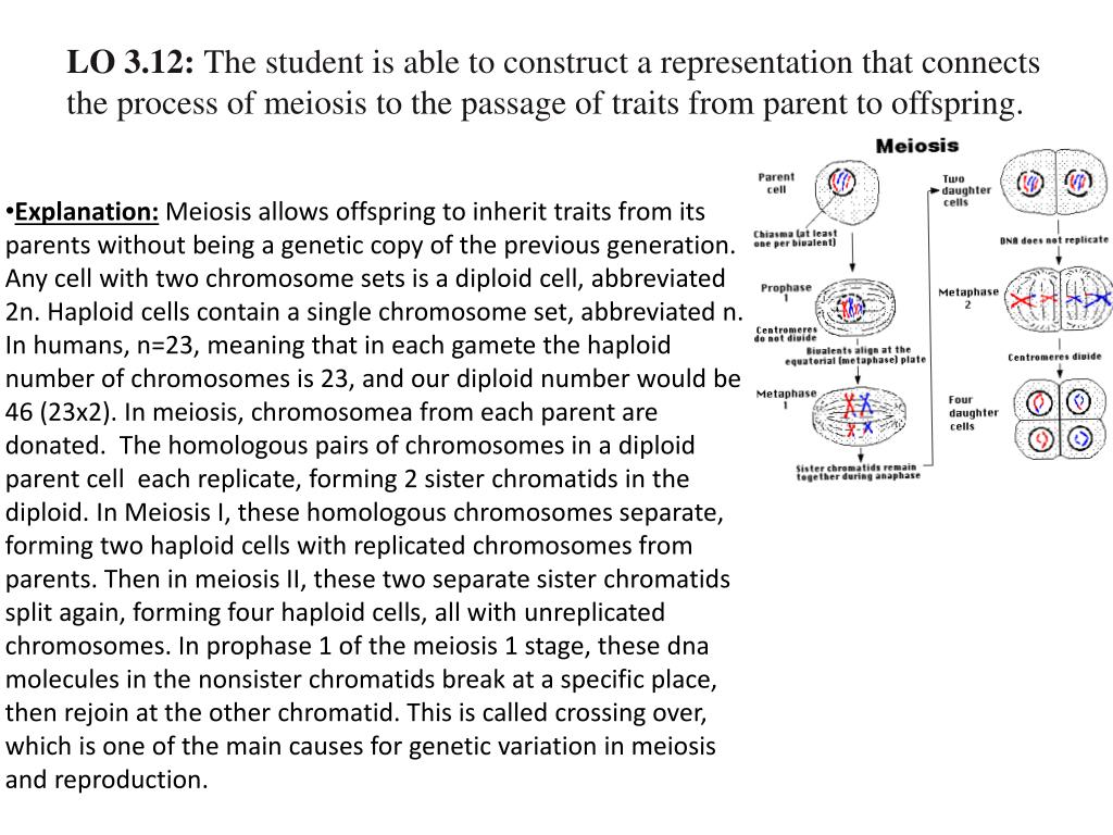 Explanation: Meiosis allows offspring to inherit traits from its parents without being a genetic copy of the previous generation. Any cell with two chromosome sets is a diploid cell, abbreviated 2n. Haploid cells contain a single chromosome set, abbreviated n. In humans, n=23, meaning that in each gamete the haploid number of chromosomes is 23, and our diploid number would be 46 (23x2). In meiosis, chromosomea from each parent are donated. The homologous pairs of chromosomes in a diploid parent cell each replicate, forming 2 sister chromatids in the diploid. In Meiosis I, these homologous chromosomes separate, forming two haploid cells with replicated chromosomes from parents. Then in meiosis II, these two separate sister chromatids split again, forming four haploid cells, all with unreplicated chromosomes. In prophase 1 of the meiosis 1 stage, these dna molecules in the nonsisterchromatids break at a specific place, then rejoin at the other chromatid. This is called crossing over, which is one of the main causes for genetic variation in meiosis and reproduction. LO 3.12: The student is able to construct a representation that connects the process of meiosis to the passage of traits from parent to offspring.