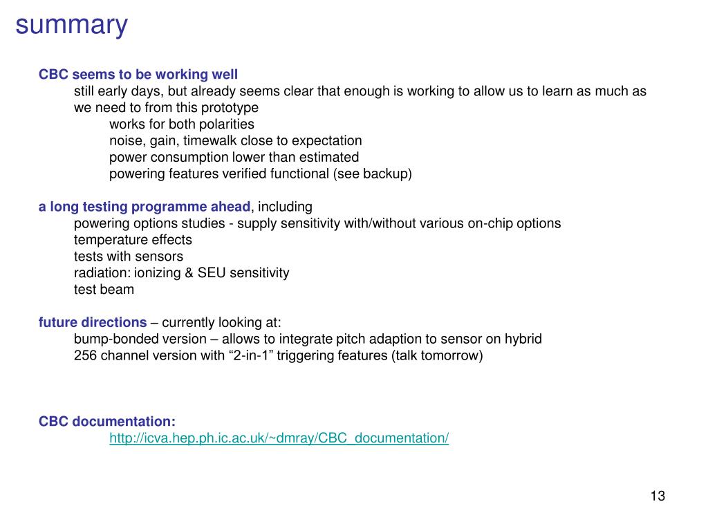 summary • CBC seems to be working well • still early days, but already seems clear that enough is working to allow us to learn as much as • we need to from this prototype • works for both polarities • noise, gain, timewalk close to expectation • power consumption lower than estimated • powering features verified functional (see backup) • a long testing programme ahead, including • powering options studies - supply sensitivity with/without various on-chip options • temperature effects • tests with sensors • radiation: ionizing & SEU sensitivity • test beam • future directions – currently looking at: • bump-bonded version – allows to integrate pitch adaption to sensor on hybrid • 256 channel version with “2-in-1” triggering features (talk tomorrow) • CBC documentation: • http://icva.hep.ph.ic.ac.uk/~dmray/CBC_documentation/