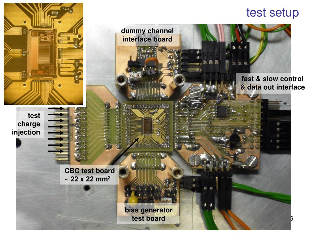 test setup dummy channel interface board fast & slow control & data out interface test charge injection CBC test board ~ 22 x 22 mm2 bias generator test board