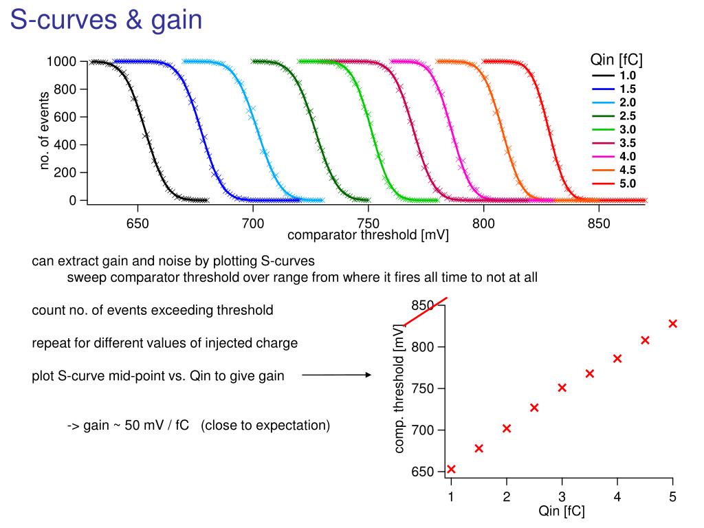 S-curves & gain • can extract gain and noise by plotting S-curves • sweep comparator threshold over range from where it fires all time to not at all • count no. of events exceeding threshold • repeat for different values of injected charge • plot S-curve mid-point vs. Qin to give gain • -> gain ~ 50 mV / fC (close to expectation)