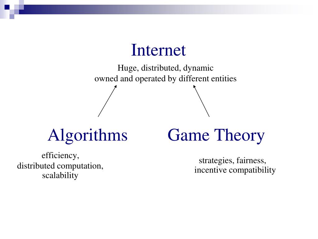 efficiency, distributed computation, scalability strategies, fairness, incentive compatibility InternetAlgorithmic Game Theory Huge, distributed, dynamicowned and operated by different entities Fusing ideas of algorithms and game theory