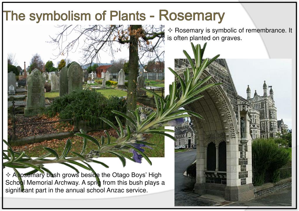 The symbolism of Plants - Rosemary • Rosemary is symbolic of remembrance. It is often planted on graves. • A rosemary bush grows beside the Otago Boys’ High School Memorial Archway. A sprig from this bush plays a significant part in the annual school Anzac service.
