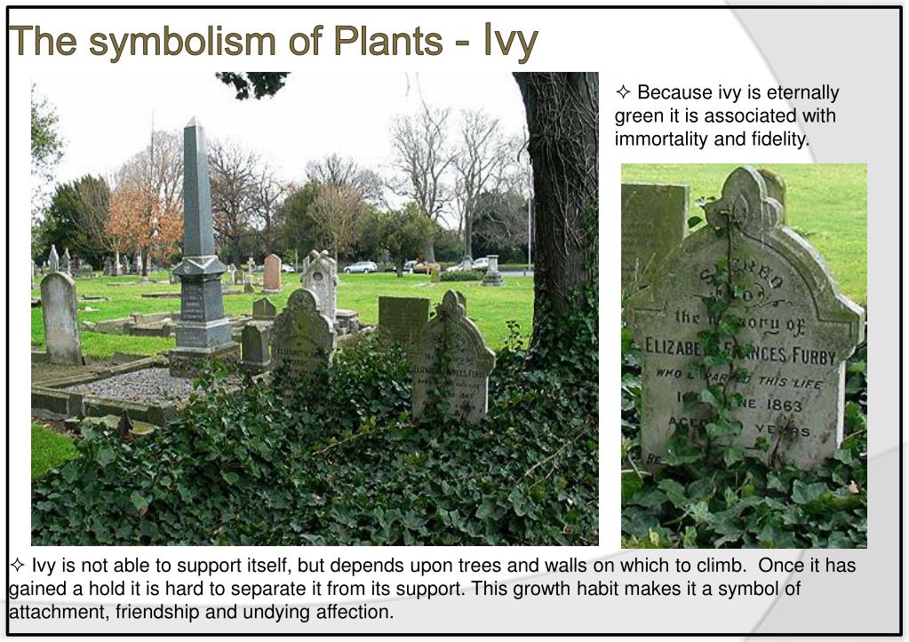 The symbolism of Plants - Ivy • Because ivy is eternally green it is associated with immortality and fidelity. • Ivy is not able to support itself, but depends upon trees and walls on which to climb. Once it has gained a hold it is hard to separate it from its support. This growth habit makes it a symbol of attachment, friendship and undying affection.