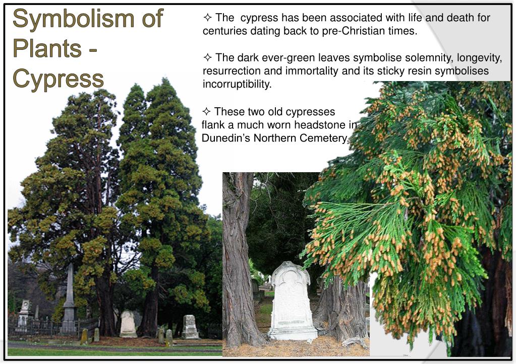 Symbolism of Plants - Cypress • The cypress has been associated with life and death for centuries dating back to pre-Christian times. • The dark ever-green leaves symbolise solemnity, longevity, resurrection and immortality and its sticky resin symbolises incorruptibility. • These two old cypresses flank a much worn headstone in Dunedin’s Northern Cemetery.