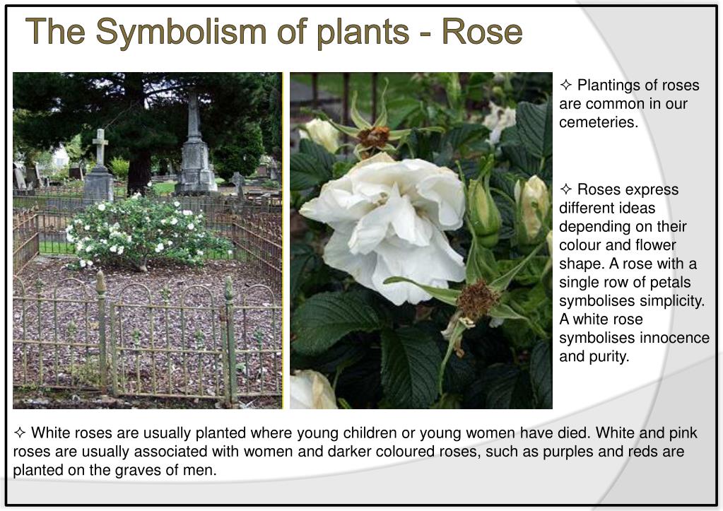 The Symbolism of plants - Rose • Plantings of roses are common in our cemeteries. • Roses express different ideas depending on their colour and flower shape. A rose with a single row of petals symbolises simplicity. A white rose symbolises innocence and purity. • White roses are usually planted where young children or young women have died. White and pink roses are usually associated with women and darker coloured roses, such as purples and reds are planted on the graves of men.