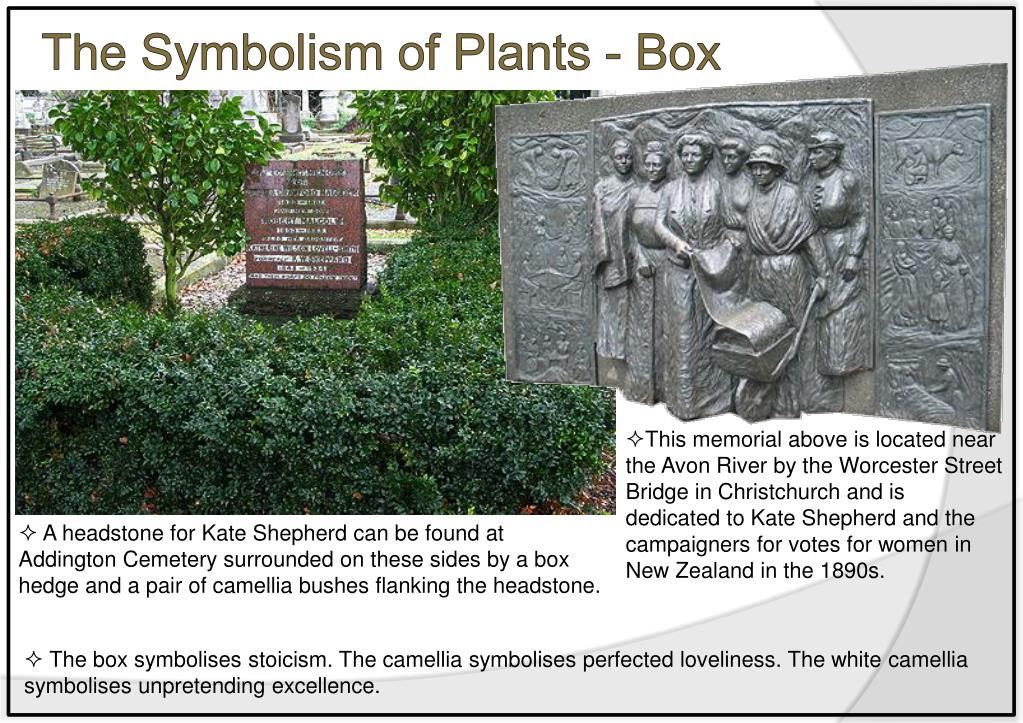 The Symbolism of Plants - Box • This memorial above is located near the Avon River by the Worcester Street Bridge in Christchurch and is dedicated to Kate Shepherd and the campaigners for votes for women in New Zealand in the 1890s. • A headstone for Kate Shepherd can be found at Addington Cemetery surrounded on these sides by a box hedge and a pair of camellia bushes flanking the headstone. • The box symbolises stoicism. The camellia symbolises perfected loveliness. The white camellia symbolises unpretending excellence.