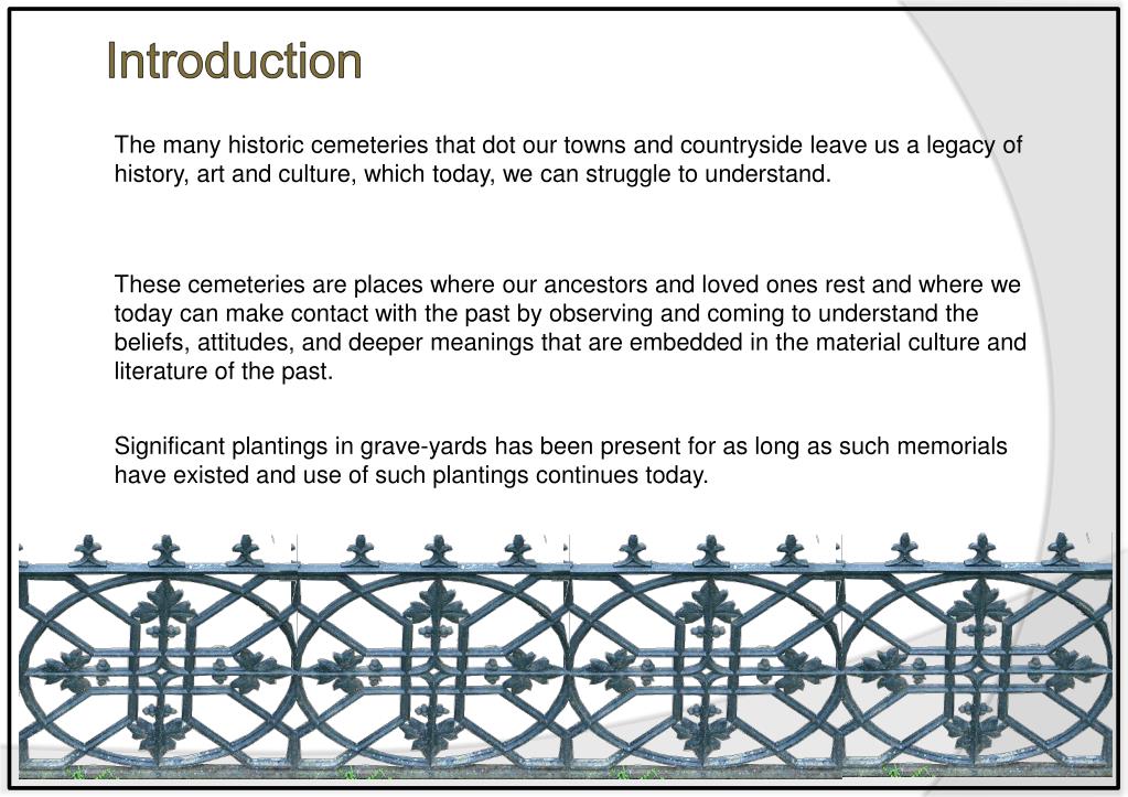 Introduction The many historic cemeteries that dot our towns and countryside leave us a legacy of history, art and culture, which today, we can struggle to understand. These cemeteries are places where our ancestors and loved ones rest and where we today can make contact with the past by observing and coming to understand the beliefs, attitudes, and deeper meanings that are embedded in the material culture and literature of the past. Significant plantings in grave-yards has been present for as long as such memorials have existed and use of such plantings continues today.
