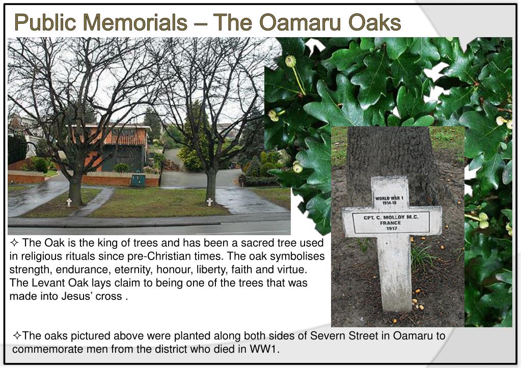 Public Memorials – The Oamaru Oaks • The Oak is the king of trees and has been a sacred tree used in religious rituals since pre-Christian times. The oak symbolises strength, endurance, eternity, honour, liberty, faith and virtue. The Levant Oak lays claim to being one of the trees that was made into Jesus’ cross. • The oaks pictured above were planted along both sides of Severn Street in Oamaru to commemorate men from the district who died in WW1.