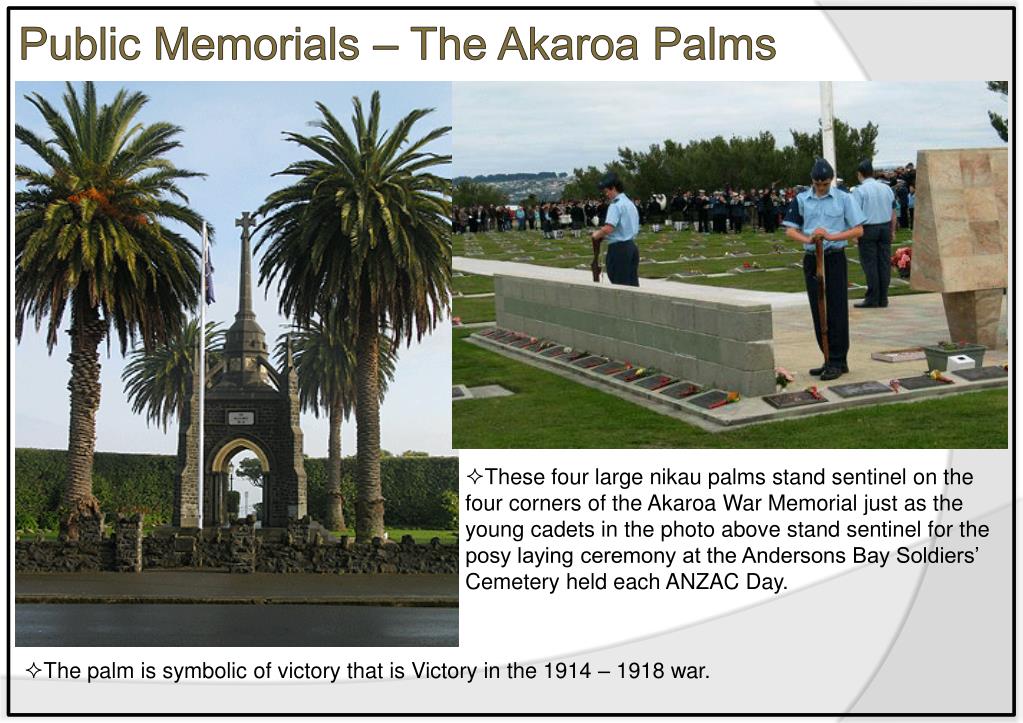 Public Memorials – The Akaroa Palms • These four large nikau palms stand sentinel on the four corners of the Akaroa War Memorial just as the young cadets in the photo above stand sentinel for the posy laying ceremony at the Andersons Bay Soldiers’ Cemetery held each ANZAC Day. • The palm is symbolic of victory that is Victory in the 1914 – 1918 war.