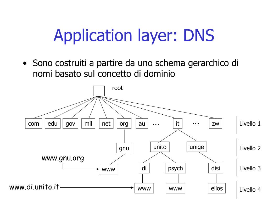 Application layer: DNS • Sono costruiti a partire da uno schema gerarchico di nomi basato sul concetto di dominio root … … com edu gov mil net org au it zw Livello 1 unito unige gnu Livello 2 www.gnu.org di psych disi Livello 3 www www.di.unito.it www www elios Livello 4