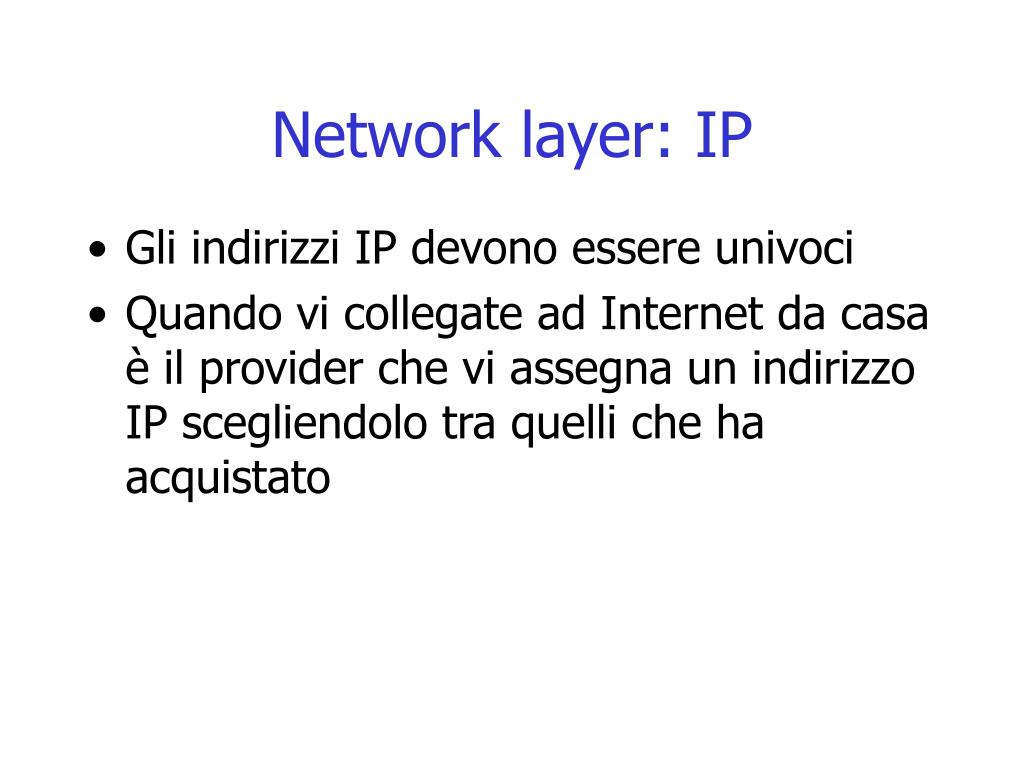 Network layer: IP • Gli indirizzi IP devono essere univoci • Quando vi collegate ad Internet da casa è il provider che vi assegna un indirizzo IP scegliendolo tra quelli che ha acquistato