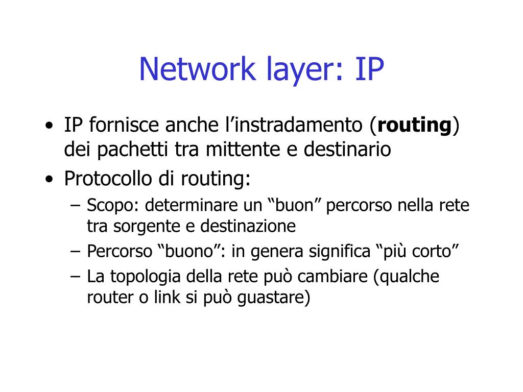Network layer: IP • IP fornisce anche l’instradamento (routing) dei pachetti tra mittente e destinario • Protocollo di routing: • Scopo: determinare un “buon” percorso nella rete tra sorgente e destinazione • Percorso “buono”: in genera significa “più corto” • La topologia della rete può cambiare (qualche router o link si può guastare)