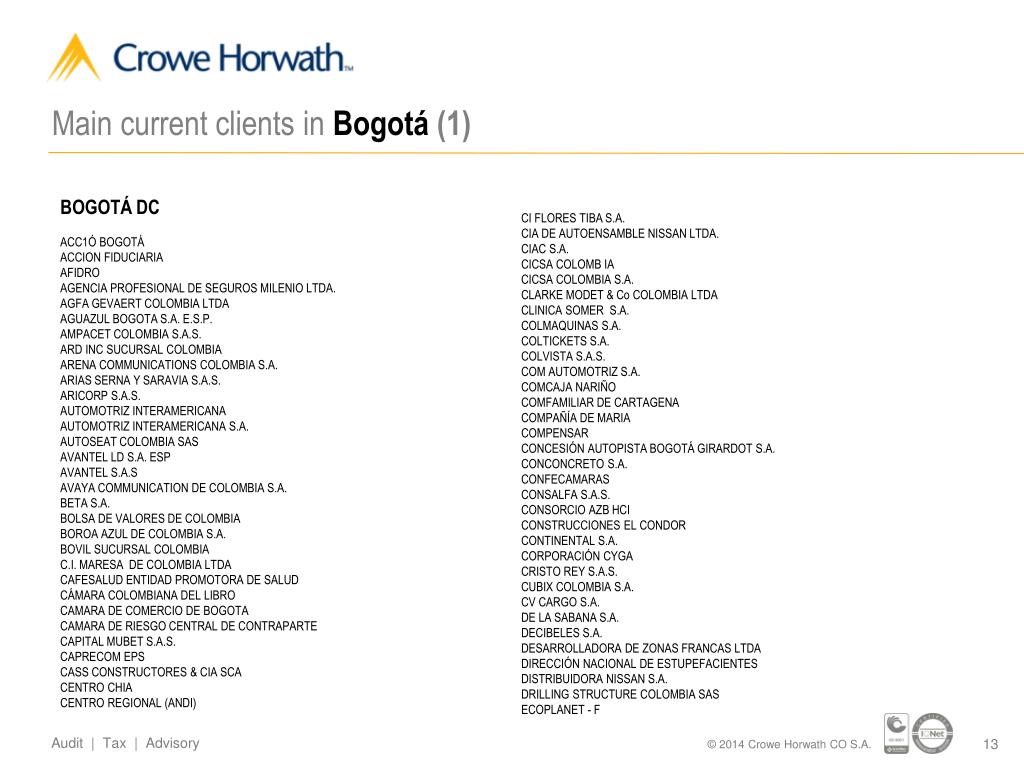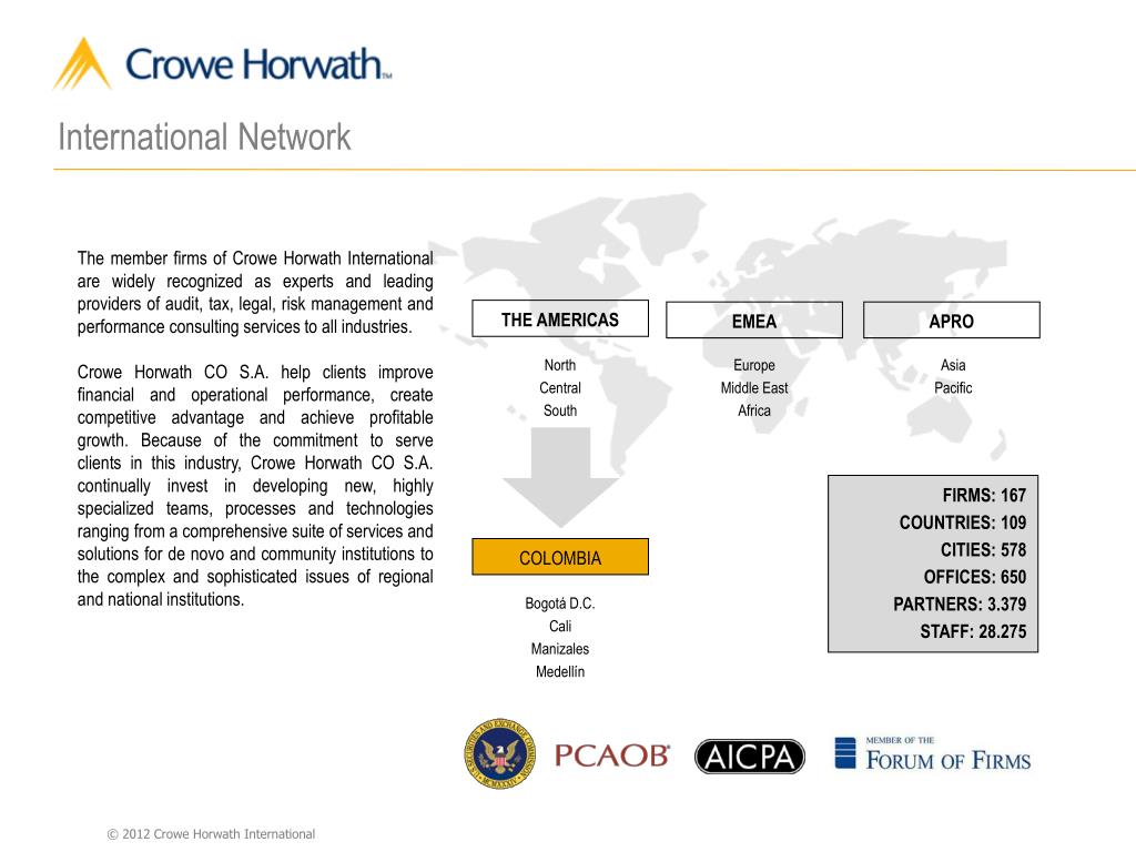 International Network The member firms of Crowe Horwath International are widely recognized as experts and leading providers of audit, tax, legal, risk management and performance consulting services to all industries. Crowe Horwath CO S.A. help clients improve financial and operational performance, create competitive advantage and achieve profitable growth. Because of the commitment to serve clients in this industry, Crowe Horwath CO S.A. continually invest in developing new, highly specialized teams, processes and technologies ranging from a comprehensive suite of services and solutions for de novo and community institutions to the complex and sophisticated issues of regional and national institutions. THE AMERICAS EMEA APRO North Central South Europe Middle East Africa Asia Pacific FIRMS: 167 COUNTRIES: 109 CITIES: 578 OFFICES: 650 PARTNERS: 3.379 STAFF: 28.275 COLOMBIA Bogotá D.C. Cali Manizales Medellín