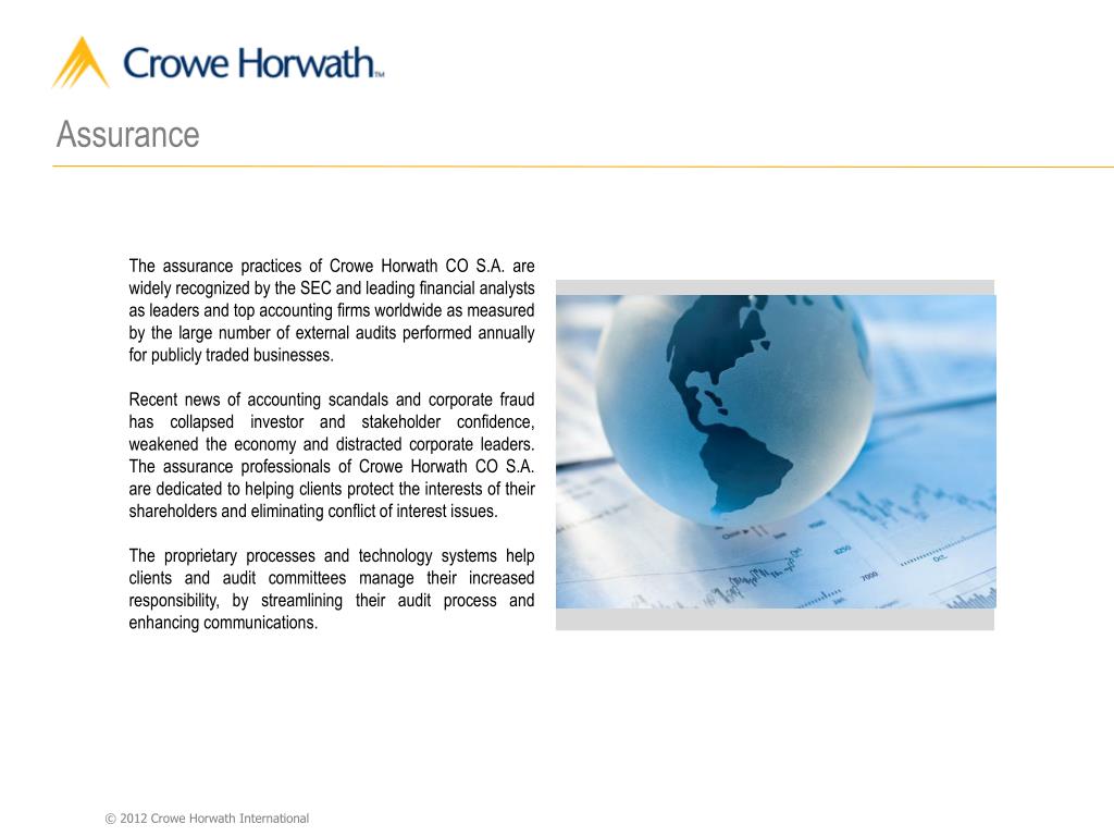 Assurance The assurance practices of Crowe Horwath CO S.A. are widely recognized by the SEC and leading financial analysts as leaders and top accounting firms worldwide as measured by the large number of external audits performed annually for publicly traded businesses. Recent news of accounting scandals and corporate fraud has collapsed investor and stakeholder confidence, weakened the economy and distracted corporate leaders. The assurance professionals of Crowe Horwath CO S.A. are dedicated to helping clients protect the interests of their shareholders and eliminating conflict of interest issues. The proprietary processes and technology systems help clients and audit committees manage their increased responsibility, by streamlining their audit process and enhancing communications.