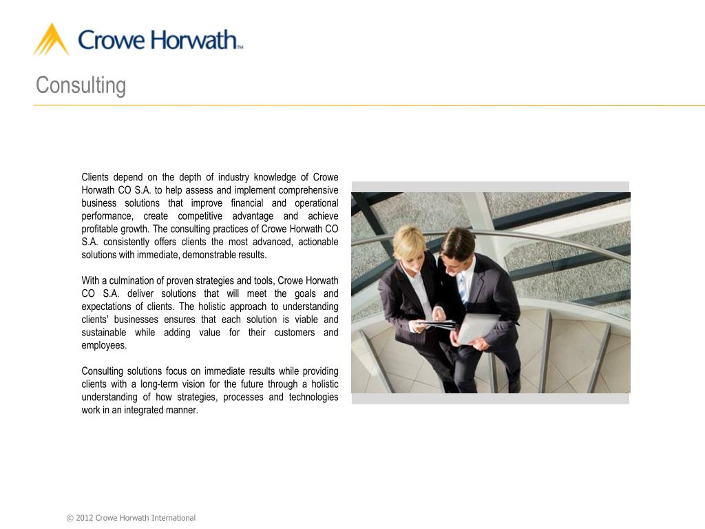 Consulting Clients depend on the depth of industry knowledge of Crowe Horwath CO S.A. to help assess and implement comprehensive business solutions that improve financial and operational performance, create competitive advantage and achieve profitable growth. The consulting practices of Crowe Horwath CO S.A. consistently offers clients the most advanced, actionable solutions with immediate, demonstrable results. With a culmination of proven strategies and tools, Crowe Horwath CO S.A. deliver solutions that will meet the goals and expectations of clients. The holistic approach to understanding clients' businesses ensures that each solution is viable and sustainable while adding value for their customers and employees. Consulting solutions focus on immediate results while providing clients with a long-term vision for the future through a holistic understanding of how strategies, processes and technologies work in an integrated manner.