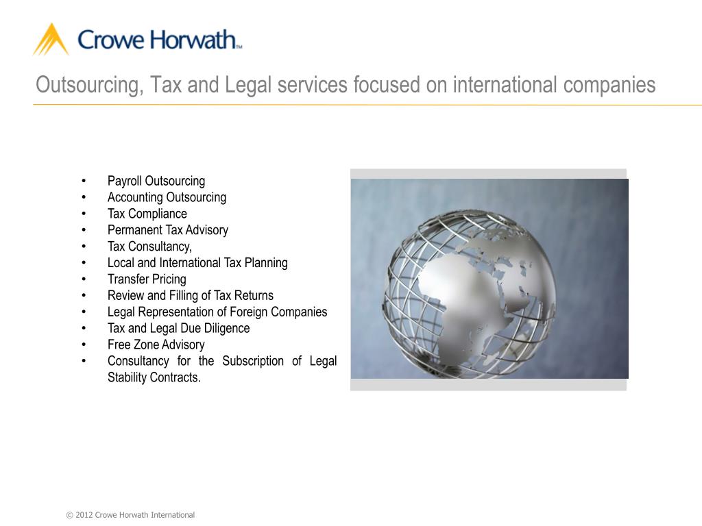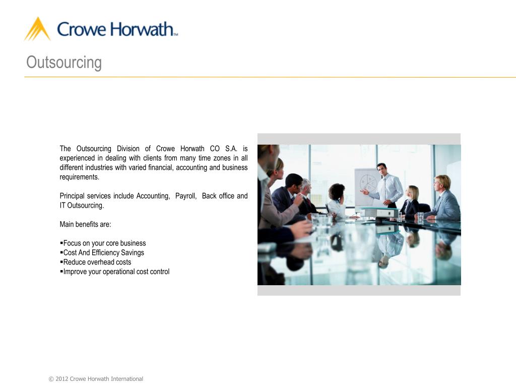 Outsourcing • The Outsourcing Division of Crowe Horwath CO S.A. is experienced in dealing with clients from many time zones in all different industries with varied financial, accounting and business requirements. • Principal services include Accounting, Payroll, Back office and IT Outsourcing. • Main benefits are: • Focus on your core business • Cost And Efficiency Savings • Reduce overhead costs • Improve your operational cost control