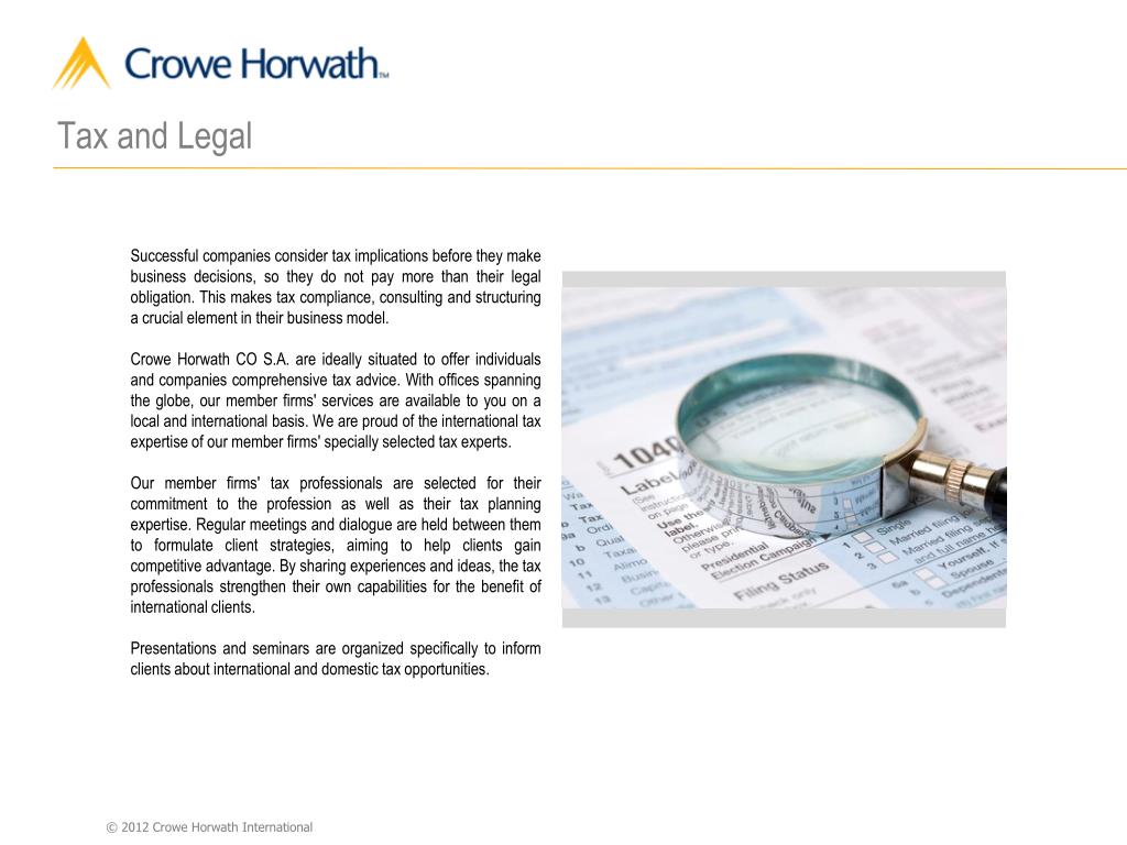 Tax and Legal Successful companies consider tax implications before they make business decisions, so they do not pay more than their legal obligation. This makes tax compliance, consulting and structuring a crucial element in their business model. Crowe Horwath CO S.A. are ideally situated to offer individuals and companies comprehensive tax advice. With offices spanning the globe, our member firms' services are available to you on a local and international basis. We are proud of the international tax expertise of our member firms' specially selected tax experts. Our member firms' tax professionals are selected for their commitment to the profession as well as their tax planning expertise. Regular meetings and dialogue are held between them to formulate client strategies, aiming to help clients gain competitive advantage. By sharing experiences and ideas, the tax professionals strengthen their own capabilities for the benefit of international clients. Presentations and seminars are organized specifically to inform clients about international and domestic tax opportunities.