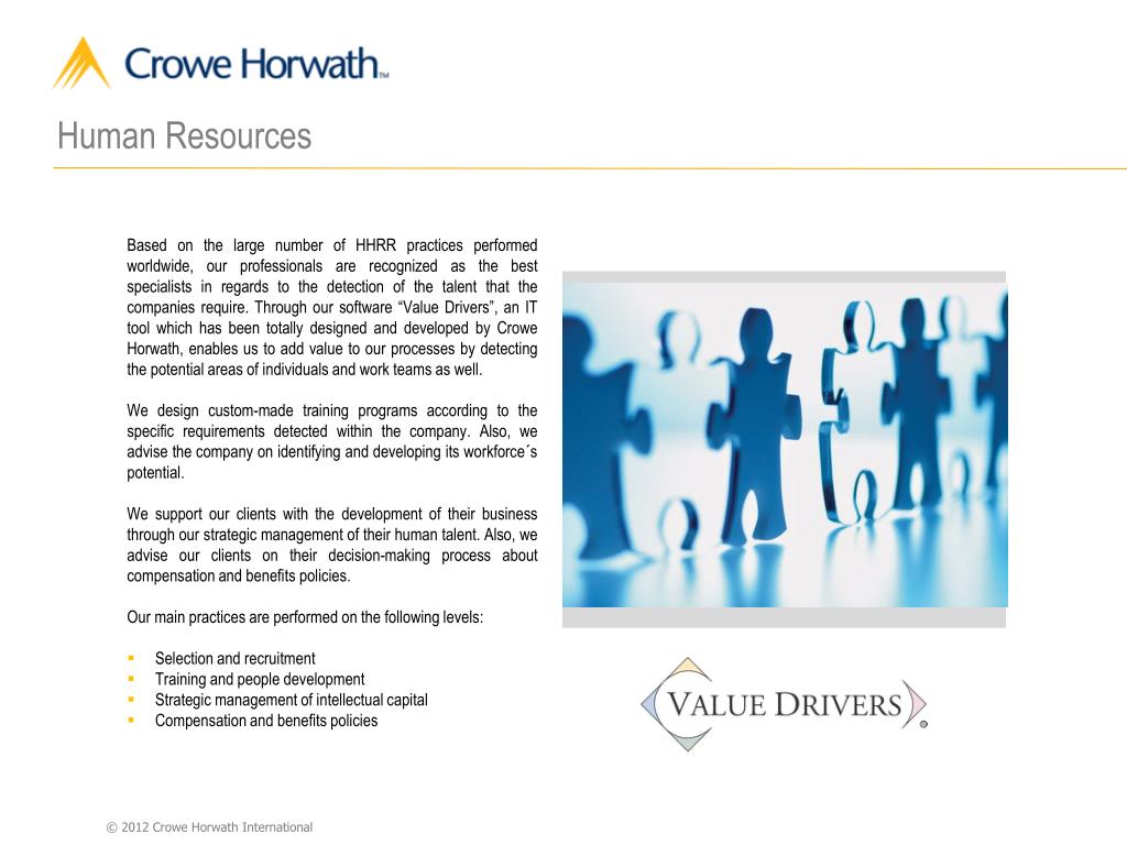 Human Resources • Based on the large number of HHRR practices performed worldwide, our professionals are recognized as the best specialists in regards to the detection of the talent that the companies require. Through our software “Value Drivers”, an IT tool which has been totally designed and developed by Crowe Horwath, enables us to add value to our processes by detecting the potential areas of individuals and work teams as well. • We design custom-made training programs according to the specific requirements detected within the company. Also, we advise the company on identifying and developing its workforce´s potential. • We support our clients with the development of their business through our strategic management of their human talent. Also, we advise our clients on their decision-making process about compensation and benefits policies. • Our main practices are performed on the following levels: • Selection and recruitment • Training and people development • Strategic management of intellectual capital • Compensation and benefits policies