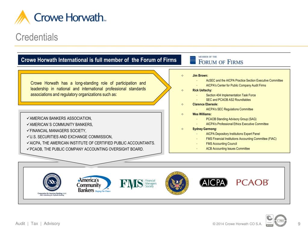 Credentials Crowe Horwath International is full member of theForum of Firms • Jim Brown: • AcSEC and the AICPA Practice Section Executive Committee • AICPA's Center for Public Company Audit Firms • Rick Ueltschy: • Section 404 Implementation Task Force • SEC and PCAOB AS2 Roundtables • Clarence Ebersole: • AICPA's SEC Regulations Committee • Wes Williams: • PCAOB Standing Advisory Group (SAG) • AICPA's Professional Ethics Executive Committee • Sydney Garmong: • AICPA Depository Institutions Expert Panel • FMS Financial Institutions Accounting Committee (FIAC) • FMS Accounting Council • ACB Accounting Issues Committee Crowe Horwath has a long-standing role of participation and leadership in national and international professional standards associations and regulatory organizations such as: • AMERICAN BANKERS ASSOCIATION, • AMERICAN´S COMMUNITY BANKERS, • FINANCIAL MANAGERS SOCIETY, • U.S. SECURITIES AND EXCHANGE COMMISSION, • AICPA, THE AMERICAN INSTITUTE OF CERTIFIED PUBLIC ACCOUNTANTS. • PCAOB, THE PUBLIC COMPANY ACCOUNTING OVERSIGHT BOARD.