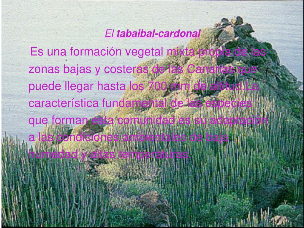 El tabaibal-cardonal Es unaformación vegetal mixta propia de las zonas bajas y costeras de las Canarias que puede llegar hasta los 700 mm de altitud.La característica fundamental de las especies queforman esta comunidad es su adaptación a las condiciones ambientales de baja humedad y altas temperaturas.