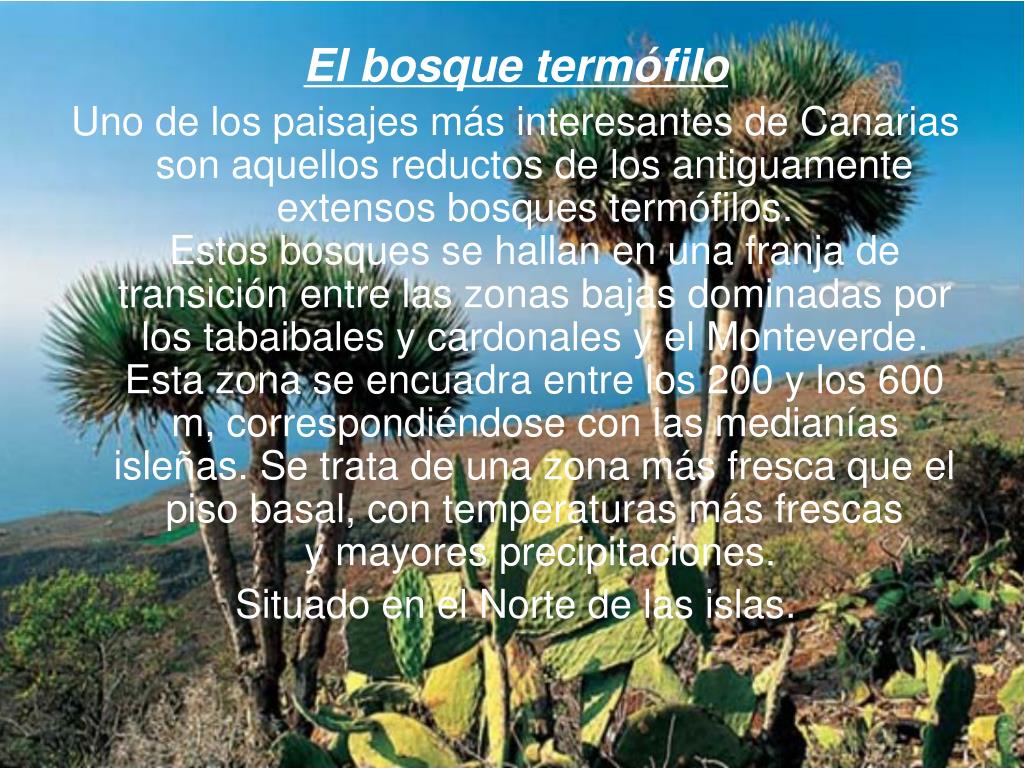 El bosque termófilo Uno de los paisajes más interesantes de Canarias son aquellos reductos de los antiguamente extensos bosques termófilos.Estos bosques se hallan en una franja de transiciónentre las zonas bajas dominadas por los tabaibales y cardonales y el Monteverde.Esta zona se encuadra entre los 200 y los 600 m, correspondiéndose con las medianías isleñas. Se trata de una zona más fresca que el piso basal, con temperaturas más frescas y mayores precipitaciones. Situado en el Norte de las islas.