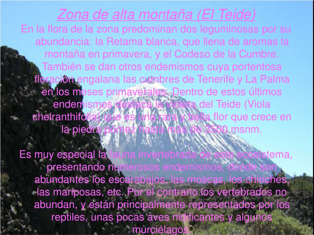 Zona de alta montaña (El Teide) En la flora de la zona predominan dos leguminosas por su abundancia: la Retama blanca, que llena de aromas la montaña en primavera, y el Codeso de la Cumbre. También se dan otros endemismos cuya portentosa floración engalana las cumbres de Tenerife y La Palma en los meses primaverales. Dentro de estos últimos endemismos destaca la violeta del Teide (Viola cheiranthifolia) que es una rara y bella flor que crece en la piedra pómez hasta más de 3500 msnm. Es muy especial la fauna invertebrada de este ecosistema, presentando numerosos endemismos, donde son abundantes los escarabajos, las moscas, los chinches, las mariposas, etc. Por el contrario los vertebrados no abundan, y están principalmente representados por los reptiles, unas pocas aves nidificantes y algunos murciélagos.