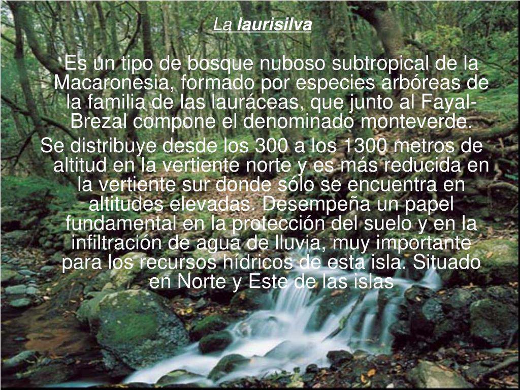 La laurisilva Es un tipo de bosque nuboso subtropical de la Macaronesia, formado por especies arbóreas de la familia de las lauráceas, que junto al Fayal-Brezal compone el denominado monteverde. Se distribuye desde los 300 a los 1300 metros de altitud en la vertiente norte y es más reducida en la vertiente sur donde sólo se encuentra en altitudes elevadas. Desempeña un papel fundamental en la protección del suelo y en la infiltración de agua de lluvia, muy importante para los recursos hídricos de esta isla. Situado en Norte y Este de las islas