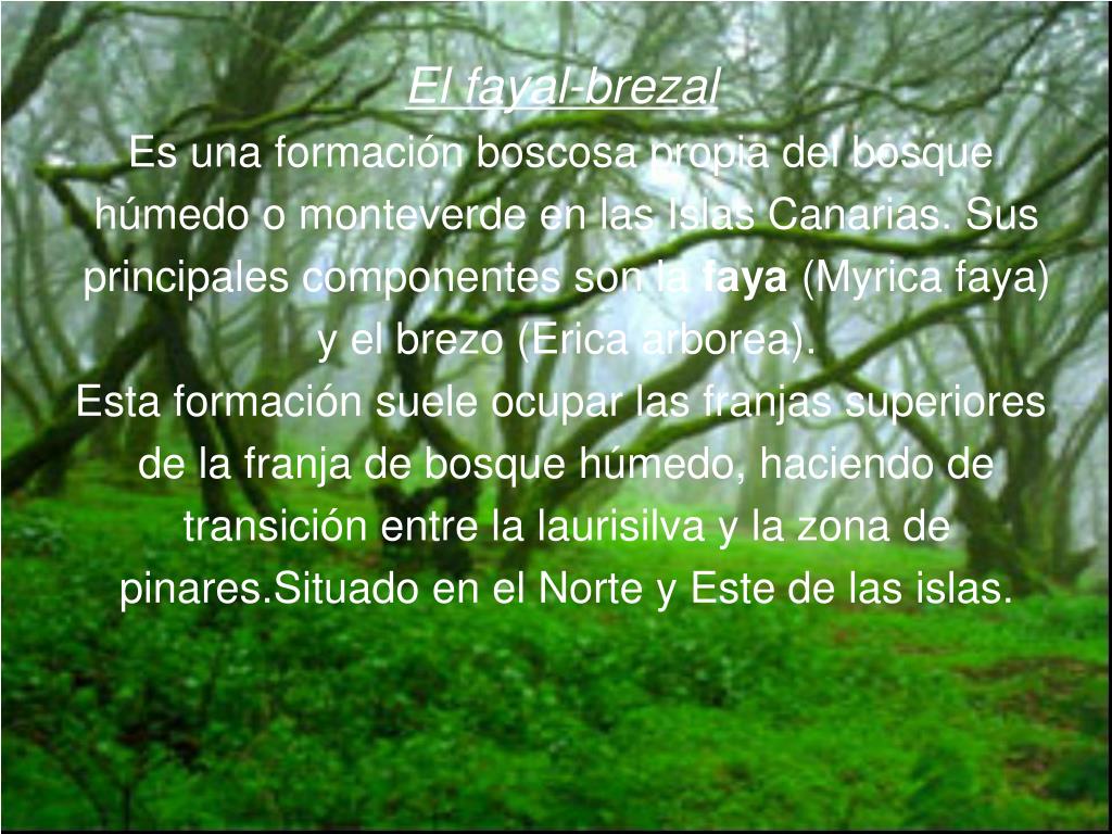 El fayal-brezal Es una formación boscosa propia del bosque húmedo o monteverde en las Islas Canarias. Sus principales componentes son la faya (Myrica faya) y el brezo (Erica arborea). Esta formación suele ocupar las franjas superiores de la franja de bosque húmedo, haciendo de transición entre la laurisilva y la zona de pinares.Situado en el Norte y Este de las islas.