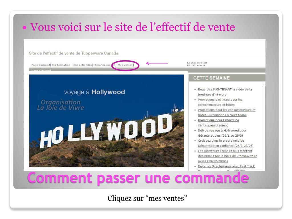 Vousvoicisur le site de l’effectif de vente Comment passer unecommande Cliquezsur “mesventes”