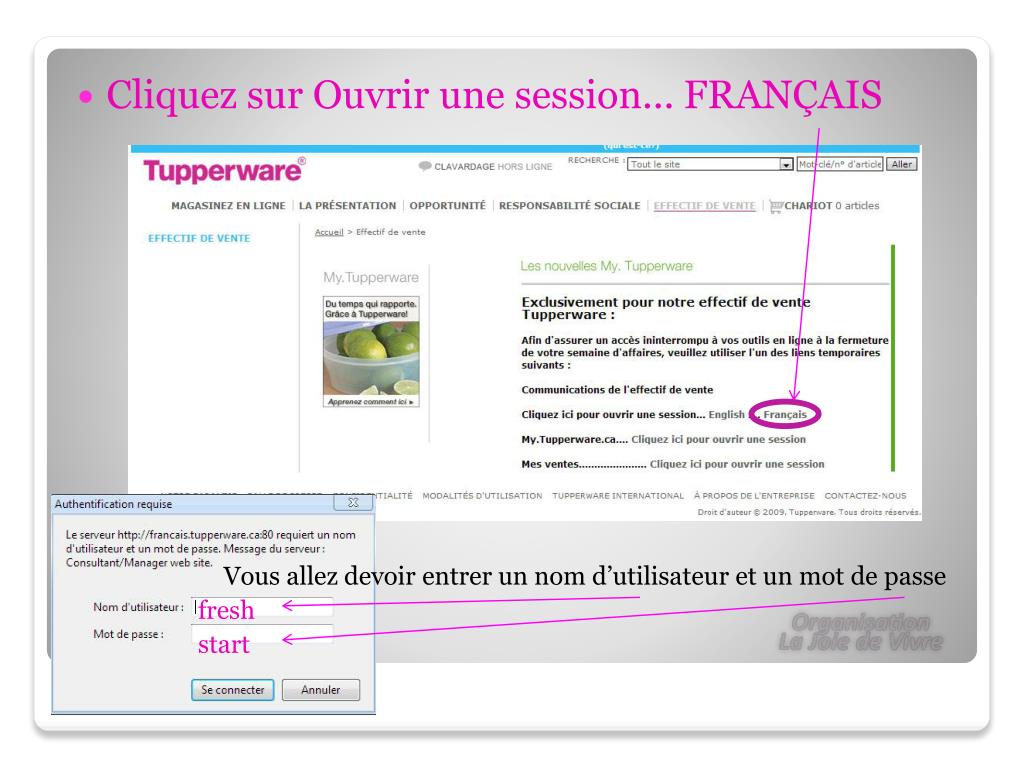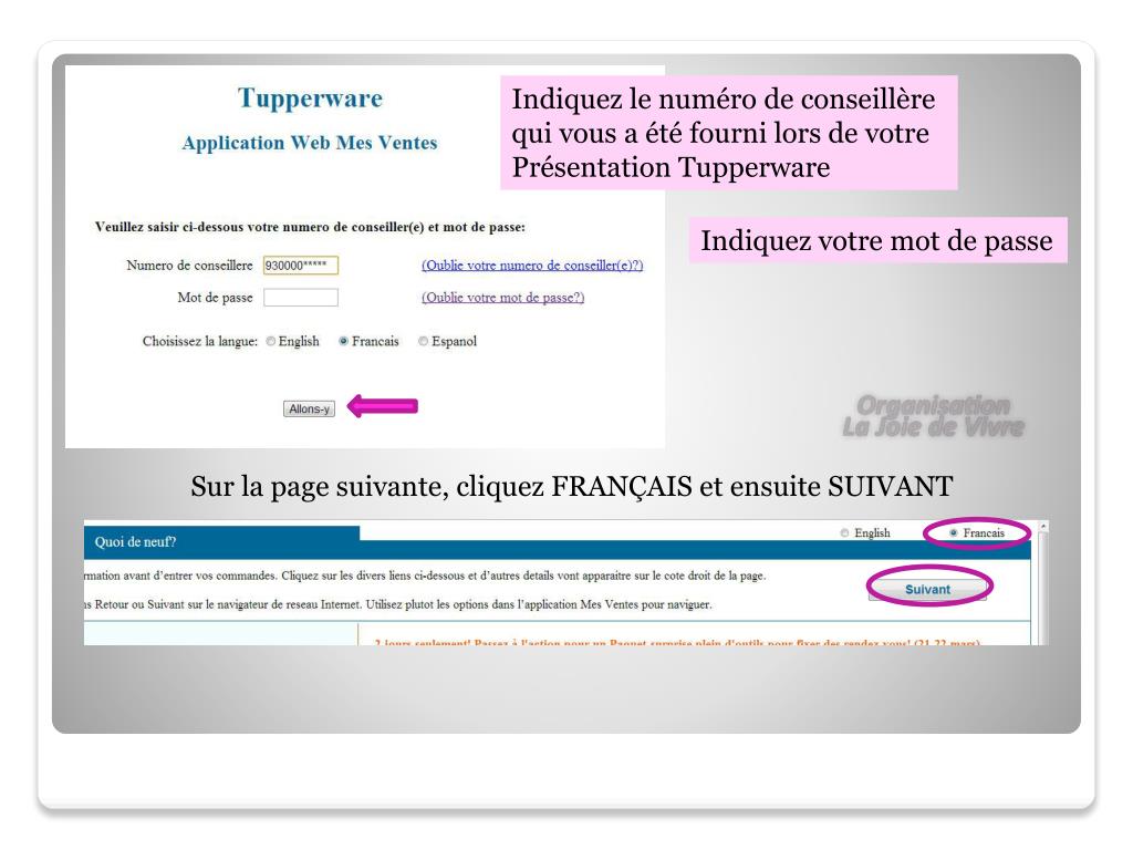 Indiquez le numéro de conseillère qui vous a étéfournilors de votre Présentation Tupperware Indiquezvotre mot de passe Sur la page suivante, cliquez FRANÇAIS et ensuite SUIVANT