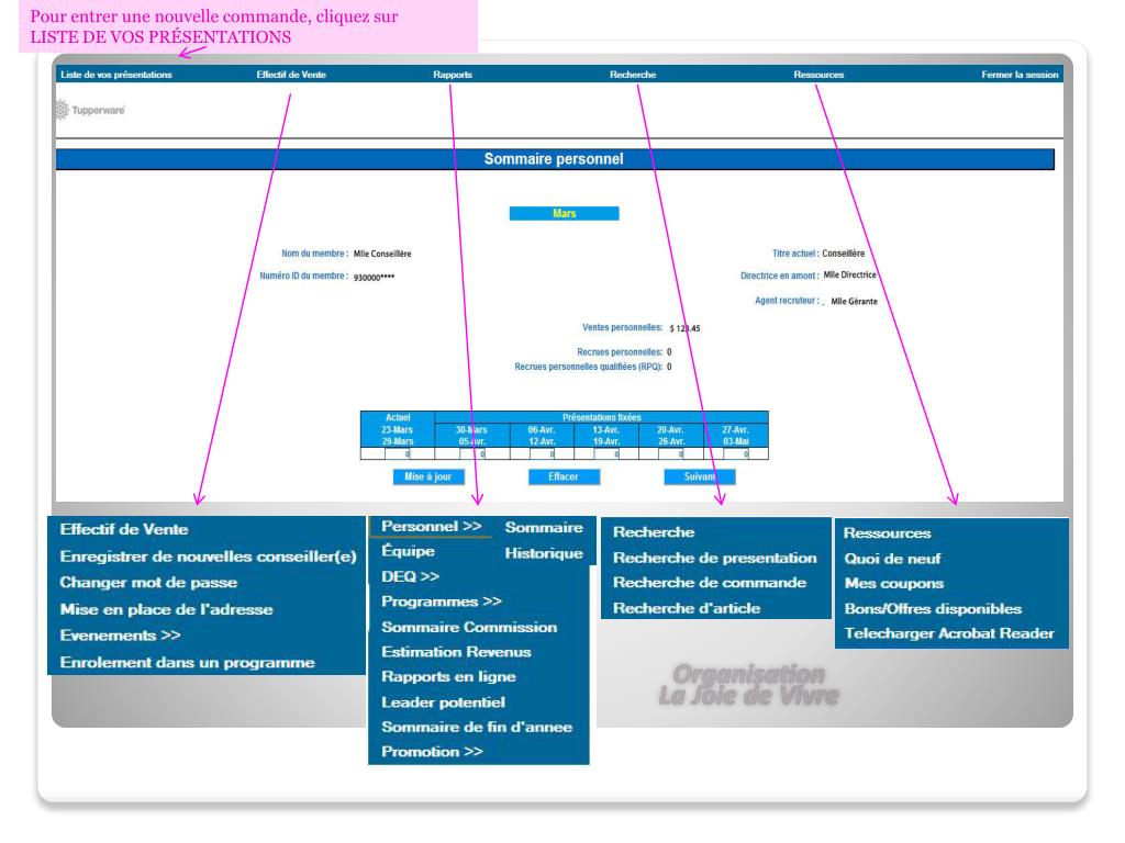 Formation La Joie de Vivre!. Bureau de L’Organisation de La Joie de Vivre 9873 Pascal Gagnon Saint-Léonard H1P 1Z4 438.382.4131. URL: http://www.Tupperware .ca Choisir anglais ou français Allez sur l’effectif de vente en bas à gauche. Découvrir le site de Tupperware.