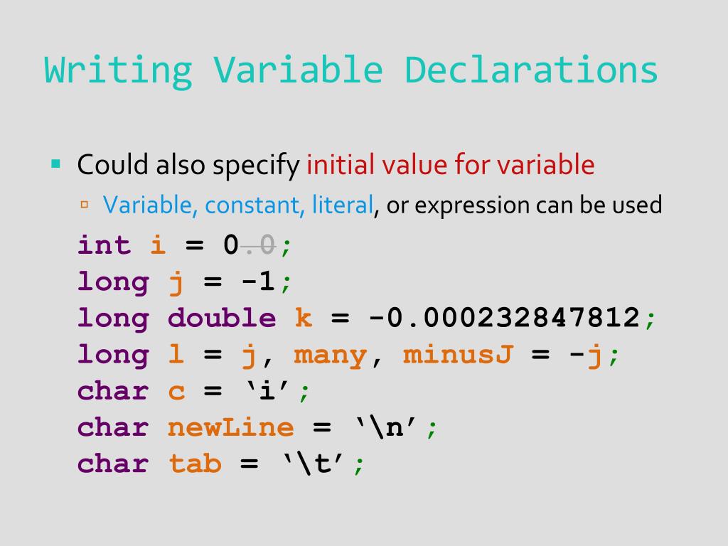 Writing Variable Declarations • Could also specify initial value for variable • Variable, constant, literal, or expression can be used inti = 0.0;long j = -1;long double k = -0.000232847812;long l = j, many, minusJ= -j;char c = ‘i’;char newLine= ‘\n’;char tab = ‘\t’;