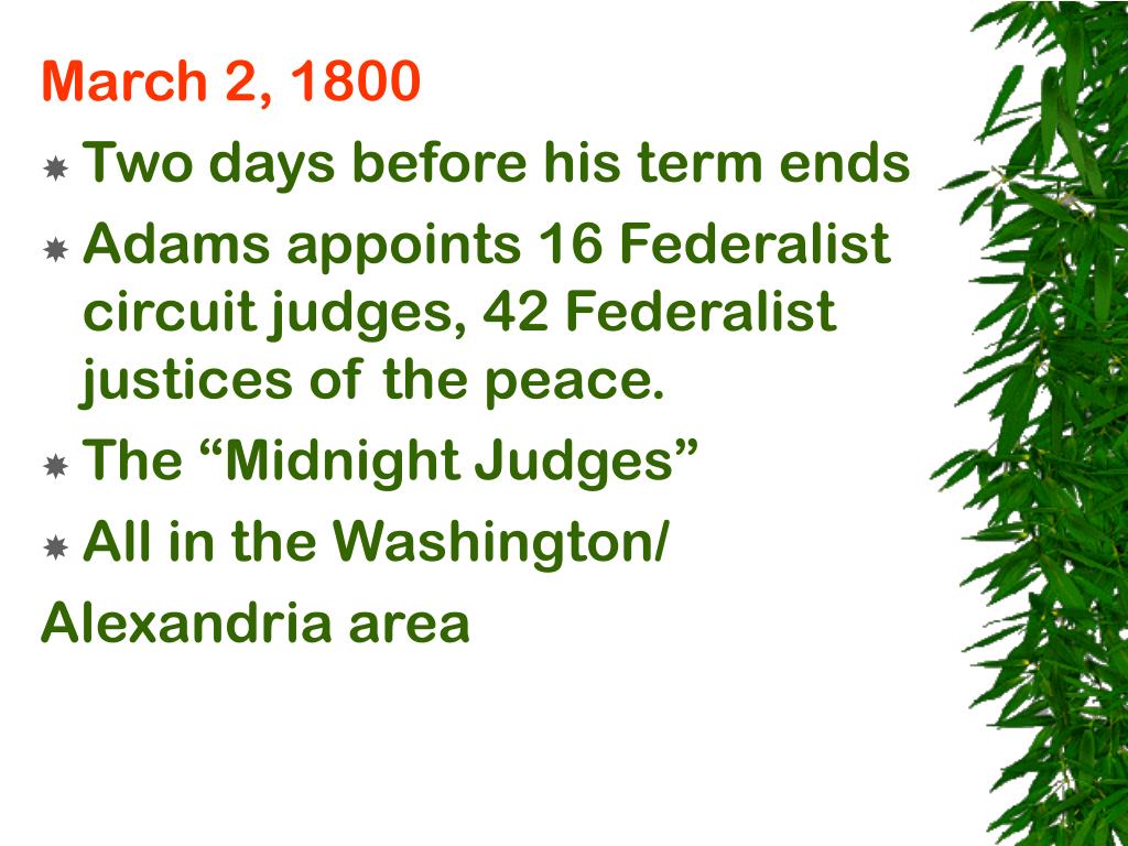 March 2, 1800 • Two days before his term ends • Adams appoints 16 Federalist circuit judges, 42 Federalist justices of the peace. • The “Midnight Judges” • All in the Washington/ Alexandria area