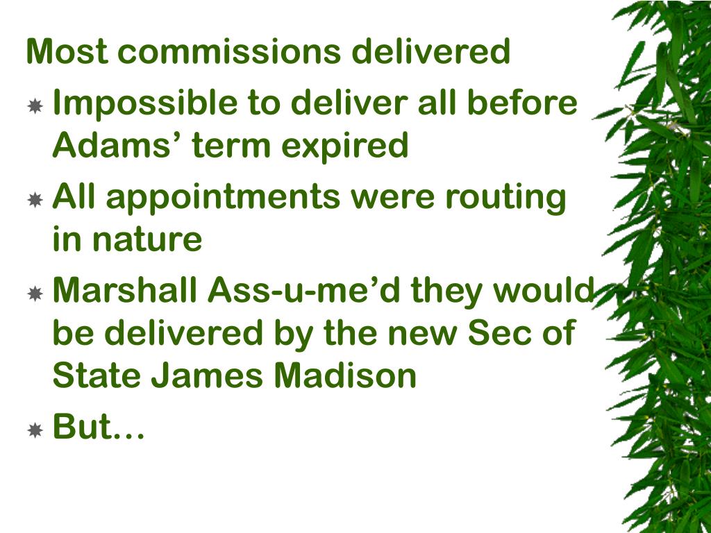 Most commissions delivered • Impossible to deliver all before Adams’ term expired • All appointments were routing in nature • Marshall Ass-u-me’d they would be delivered by the new Sec of State James Madison • But…